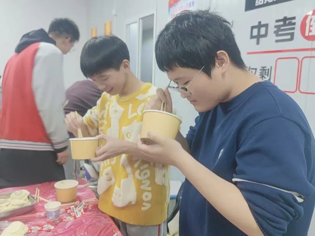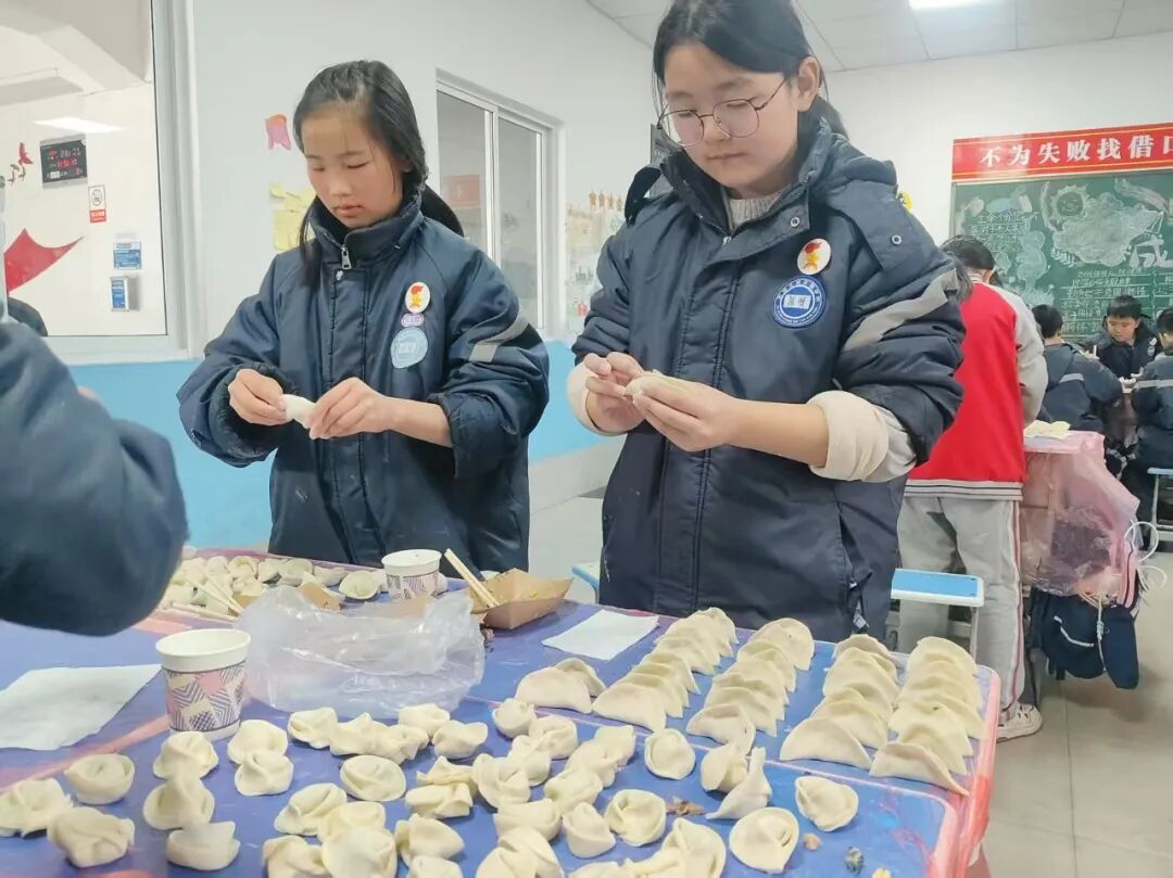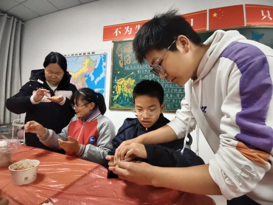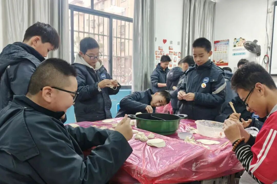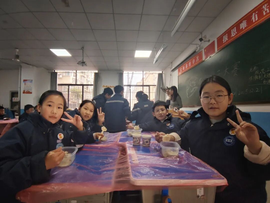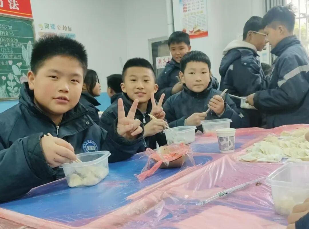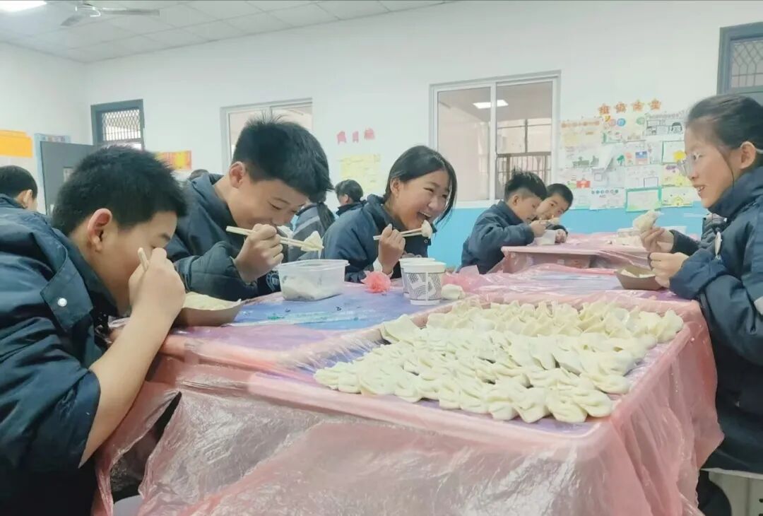 一鍋鍋熱氣騰騰的餃子香氣四溢。同學們圍坐在一起,品嘗著自己親手包的餃子,臉上洋溢著幸福自豪的笑容。大家一邊分享勞動成果,一邊交流勞動心得,還主動將熱騰騰的餃子送到門衛爺爺、保潔阿姨和老師們手中,用實際行動傳遞對師長的敬意和節日的溫暖。